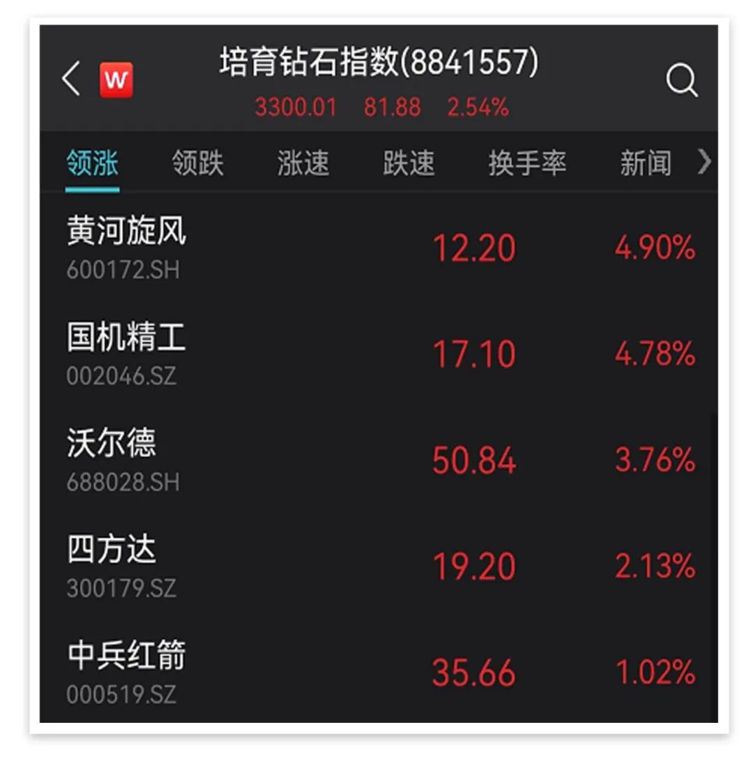 Wind培育钻石指数连创新高,盘初一度涨超7%,之后回吐升幅,收涨2.54%。黄河旋风、四方达、国机精工、沃尔德大涨,北交所惠丰钻石大涨15.26%。