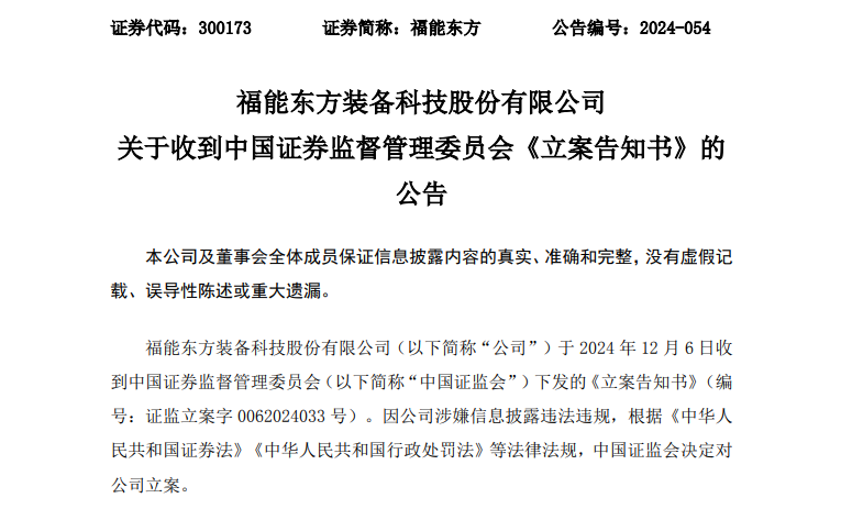 12月6日晚间,福能东方(300173)发布收到中国证券监督管理委员会《立案告知书》的公告称,因公司涉嫌信息披露违法违规,根据《中华人民共和国证券法》《中华人民共和国行政处罚法》等法律法规,中国证监会决定对公司立案。
