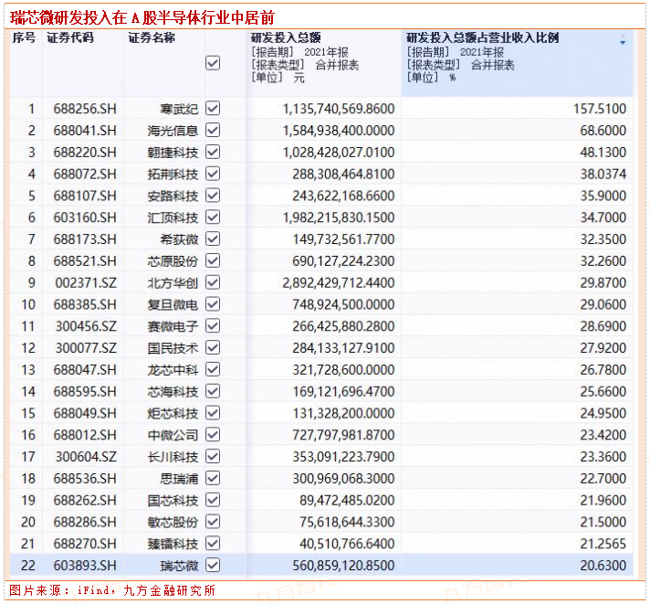 我们关注瑞芯微的逻辑很简单粗暴——这家公司在研发投入上很舍得下功夫,而持续大规模的研发投入,是半导体企业成长的核心驱动力。2021年,申万半导体分类125只个股中,瑞芯微以5.6亿研发投入位居第21位,研发投入占比达到20.63%位列第22位,由此可以看出其在研发上属于A股半导体的佼佼者。