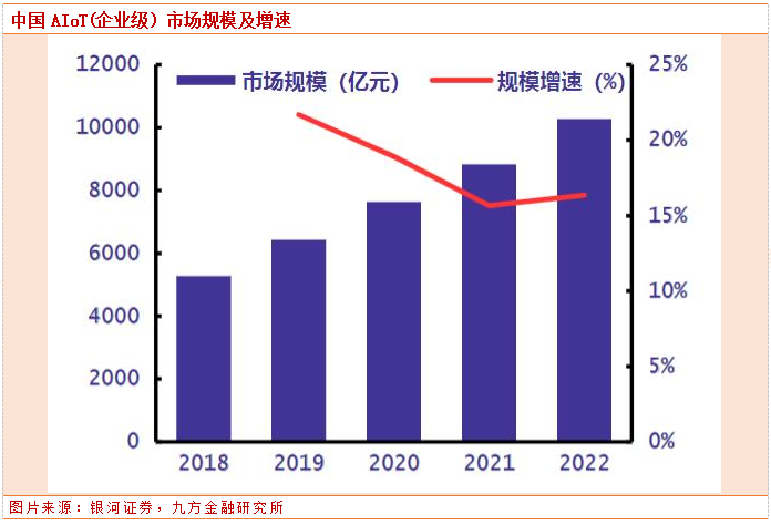 物联网——快速崛起的新市场。根据IDC最新预测数据,2021年全球物联网(企业级)支出规模达6902.6亿美元,并有望在2026年达到1.1万亿美元,2022-2026年复合增长率达10.7%。中国是最有潜力的AIoT市场,根据挚物产业研究院测算,中国AIoT(企业级)市场规模2022年将达到10280亿元,同比增速16.4%,在全球市场规模中占比将近20%,物联网市场体量全球最大,预计至2026年这一比例有望提升至26%。