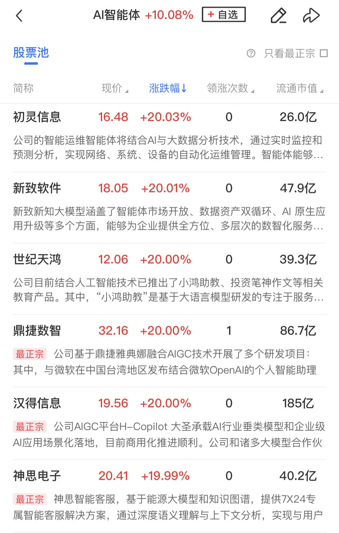 板块上,AI智能体涨幅居前,世纪天鸿、鼎捷数智、楚天龙、杰创智能、思特奇、新炬网络、南兴股份、垒知集团、盛通股份涨停。 消息面上,北京智谱华章科技发文宣布,旗下智谱GLM-PC开放体验,宣称“自主操作电脑的多模态Agent再升级”。此外华为常务董事余承东日前在视频中透露,华为春节将推出小艺APP,包含多种智能体。