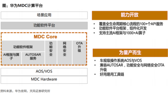 计算平台:华为MDC(MobileDataCenter:移动数据中心)定位为智能驾驶的计算平台。此平台集成了华为在ICT领域30多年的硏发与生产制造经验,搭载智能驾驶操作系统AOS、VOS及MDCCore,兼容AUTOSAR,支持L2+~L5平滑演进,结合配套的完善工貝链,客户或生态合作伙伴可灵活快速的开发岀针对不同应用场景的智能驾驶应用。