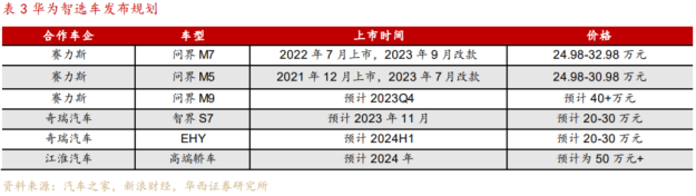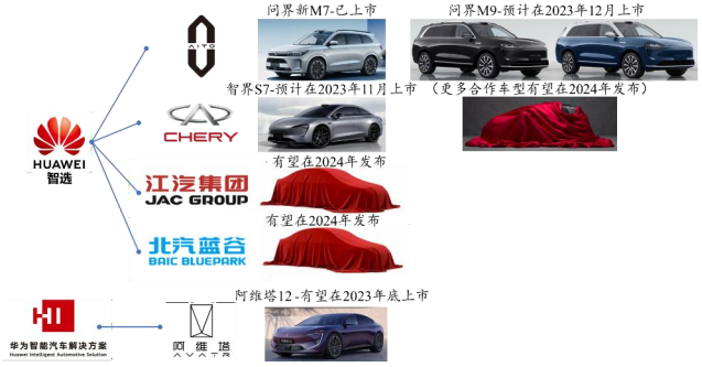 华为ADS2.0迭代+整车平台全新迭代,将于2023-2024年密集发布新车。其中赛力斯新M7已于9月12日发布交付;旗舰级SUVM9将于Q4上市;华为奇瑞纯电轿跑智界S7将于11月下旬上市;2024年,与江淮的合作的纯电轿车也有望推出。