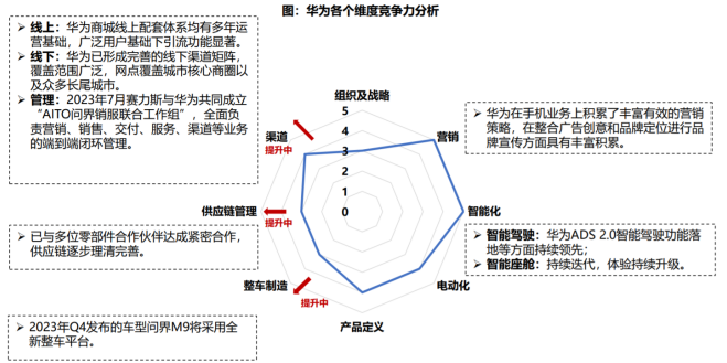 华为在智能化方面秉持平台+生态的战略,建立全栈式智能化解决方案,处于行业领先水平,自研深度硬实力将为华为长期领先保驾护航。华为自身渠道+品牌力+营销等软实力也同样领先,多年终端业务积累使得华为在消费者洞察、产品定义等方面具有独特优势,整车视角下华为综合实力出色。