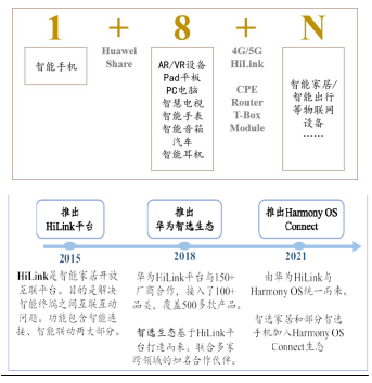 华为全面的生态布局,万物互联。华为布局“1+8+N”,打造万物互联生态布局,汽车是其中重要一环。华为在已有的IoT、Wi-Fi、Cloud、AI等技术的发展上,催生了边缘计算、云管理、AIOps等新的市场,将企业ICT带入了数据驱动的智能时代。“1+8+N”中的“1”就是手机为主入口,“8”就是4个大屏的入口:PC、平板、智慧大屏、车机,和4个非大屏入口即耳机、音箱、手表,眼镜,N则是泛IoT硬件构成的华为HiLink生态。