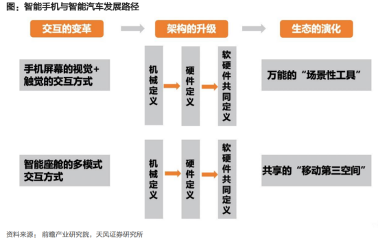 3.智能汽车与智能手机相似度较高,且存在大量创新点,让科技型企业能够充分发挥。智能手机与智能汽车作为移动互联网浪潮下划时代的产物,皆遵循着“交互的变革—>架构的升级—>生态的演化”的发展路径。同时,在模式以及阵营的选择上,智能汽车也延续着智能手机的变化。特斯拉在技术及收费模式上被接受,也让各大科技型企业看到了软件定义汽车的更多可能性。