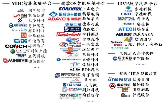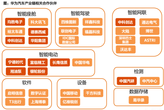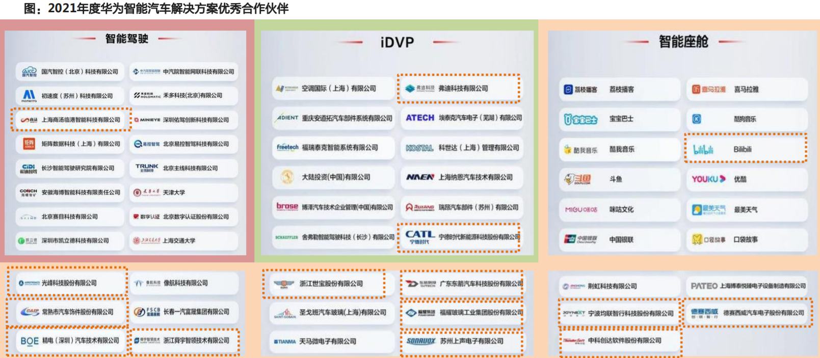华为智能汽车解决方案优秀合作伙伴,其中包括福耀玻璃、常熟汽饰、上声电子、德赛西威、均胜电子等汽车零部件上市公司。