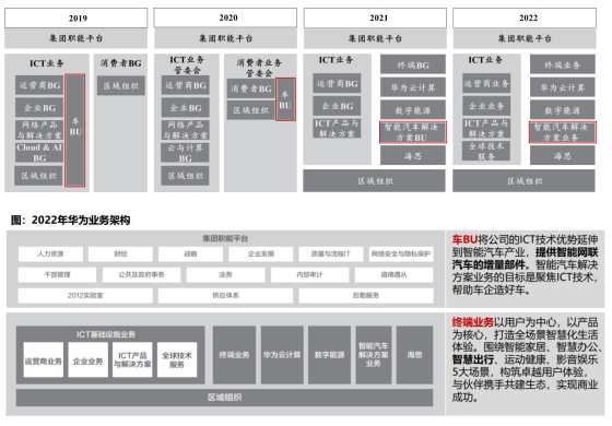 组织架构—架构不断调整,逐步走向稳定。车BU历经ICT部门管理(徐直军)→终端BG管理(余承东)→再次独立于终端BG(余承东)三次调整;智选业务由终端BG(余承东)管理。