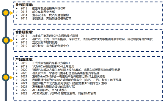 华为自2013年宣布入局车联网以来,在汽车领域产品已拓展至智能驾驶、智能座舱、智能车云、智能电动四大板块,定位软硬件系统集成商,并与多家车企展开深度合作。