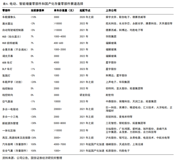 3.增量零部件:增量零部件主要围绕数据流和能源流两条线展开,数据流从获取、储存、输送、计算再应用到车端实现智能驾驶、应用到人端通过视听触等五感进行交互(HUD、中控仪表、车灯、玻璃等);能源流(双碳战略下核心是电流)从获取、储存、输送、高低压转换、经OBC到1)大三电(高压动力电池、电控及驱动电机)以支持智能驾驶“大运动”(线控制动和转向等平面位移)、2)小三电(低压电池、中小微电控及电机)以支持车身各种“精细运动”(鹰翼门、电吸门把手、电动天窗、空气悬架等车内形变)。标的方面推荐星宇股份、福耀玻璃、德赛西威、拓普集团、华阳集团、伯特利、上声电子、科博达、玲珑轮胎等。