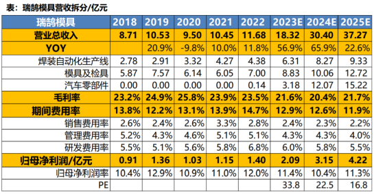 瑞鹄模具:1)华为-奇瑞合作车型E03/EH3/E0Y/EHY均实现车身结构件的配套,单车价值量约为2700元,持续获取后续E05/E06相关车型订单;2)装备制造业务订单稳定增长,20/21/22年末在手订单分别为20/24/30亿元;3)借力奇瑞新能源战略转型,成为奇瑞轻量化结构件唯一供应商,营收有望快速提升。