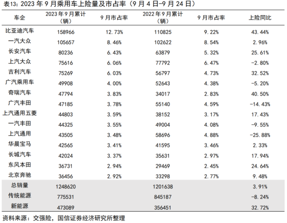 9月4日-9月24日乘用车整体上险量排名前五的是比亚迪、一汽大众、长安汽车、上汽大众和吉利汽车,上险量分别为158966、105657、80236、75616、75269,同比+43%、+3%、+26%、-3%、+33%,市占率分别为13%、8%、6%、6%、6%。