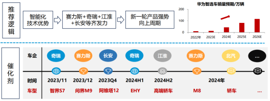 借助华为强大技术优势(尤其是智能化)+品牌渠道优势+产品定义能力+供应链重塑能力,加入智选车企(北汽+赛力斯+奇瑞+江淮等)不断增加,有望打造全新商业模式。