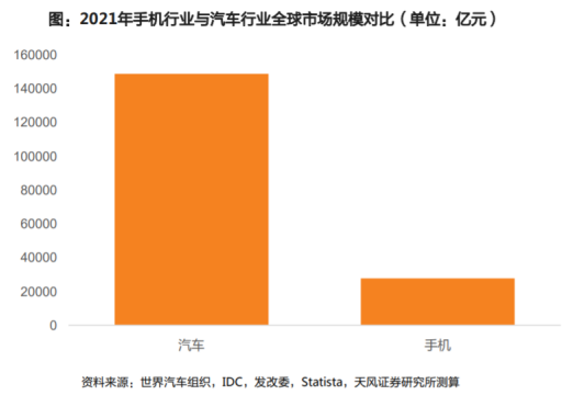 1.全球汽车产业规模足够庞大,十万亿产值。2021年,全球汽车销量总计8268万辆,中国市场汽车销量为2628万辆,为全球第一大汽车消费市场。中国汽车行业产值超过8.6万亿,占GDP总额的7%以上,市场空间与机遇大。对比来看,2021年全球智能手机出货量13.54亿台,假设按汽车均价18万元,手机均价2050元测算,全球汽车/智能手机的市场规模分别为14.88万亿和2.78万亿,汽车市场规模更大,也足够容纳更多巨头。