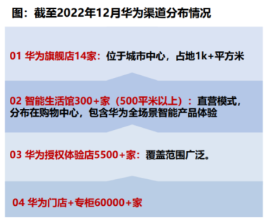 渠道—布局广泛,店效提升可期。华为终端业务渠道布局情况:截至2022年底,华为已在全球建立超过60,000家门店和专柜,包含超过5,500家体验店、2,200余家华为授权服务中心。同时华为持续在全球核心城市建设支撑高端体验的大型旗舰店与智能生活馆,店内提供人、车、家互联的沉浸式、全场景体验,服务本地社区。截至2022年底,华为全球旗舰店达到14家,全球500平米以上的智能生活馆超过300家。