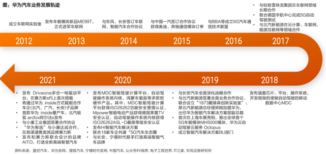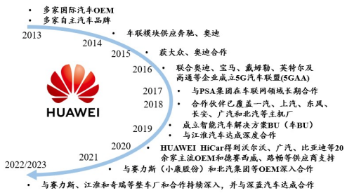 华为布局汽车相关业务多年,主机厂合作伙伴众多。