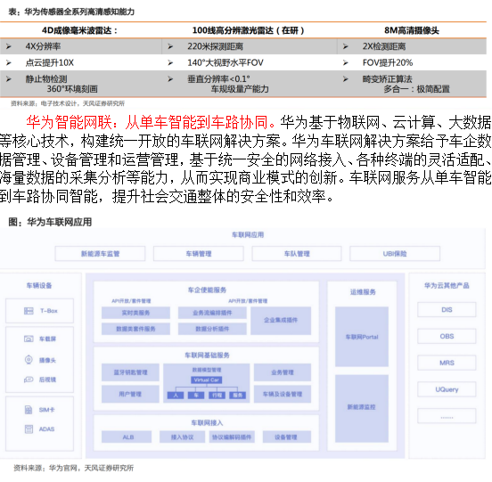 华为在车载摄像头、毫米波雷达及激光雷达领域均有布局,规划的产品性能对标行业最领先企业。