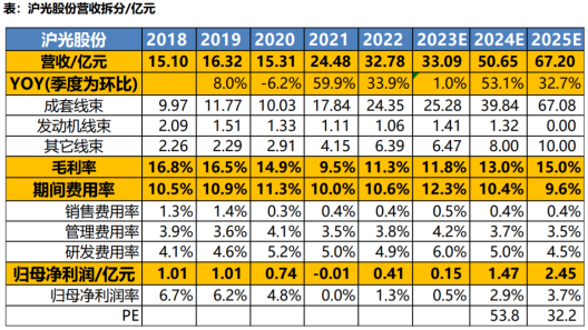 沪光 股份 | 问界品牌全系车型高低压线束供应商,赛力斯同步开发合作伙伴。公司是国内车载线束龙头企业,单车可配套的价值量较高,受益于电动化车型单车线束价值提升的趋势。公司为赛力斯提供同步开发设计,已量产问界M5/M7高低压线束,有望持续配套华为智选车。 |