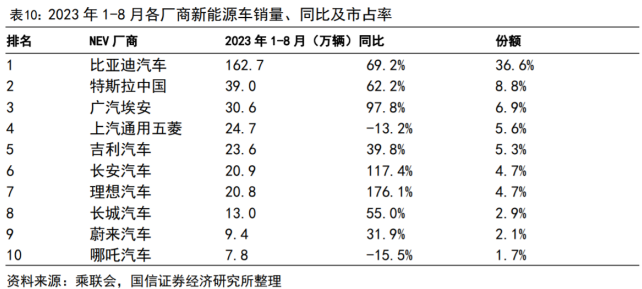 2023年1-8月新能源汽车车企乘用车零售销量排名前三的为比亚迪汽车、特斯拉中国、广汽埃安。比亚迪2023年1-8月销量为162.7万辆,位居第一,较去年同期上涨69.2%;特斯拉中国累计销量为39万辆,位居第二,较去年同期上涨62.2%;广汽埃安累计销量为30.6万辆,位居第三,较去年同期上涨97.8%。