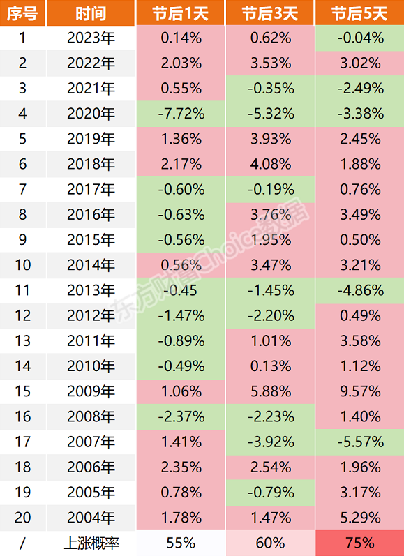 复盘历年行情,在2004年—2023年间,上证综指在春节后的首个交易日没有明显的“开门红”规律,有11个年份节后首日上涨,另外9个年份首日收跌,上涨概率55%。