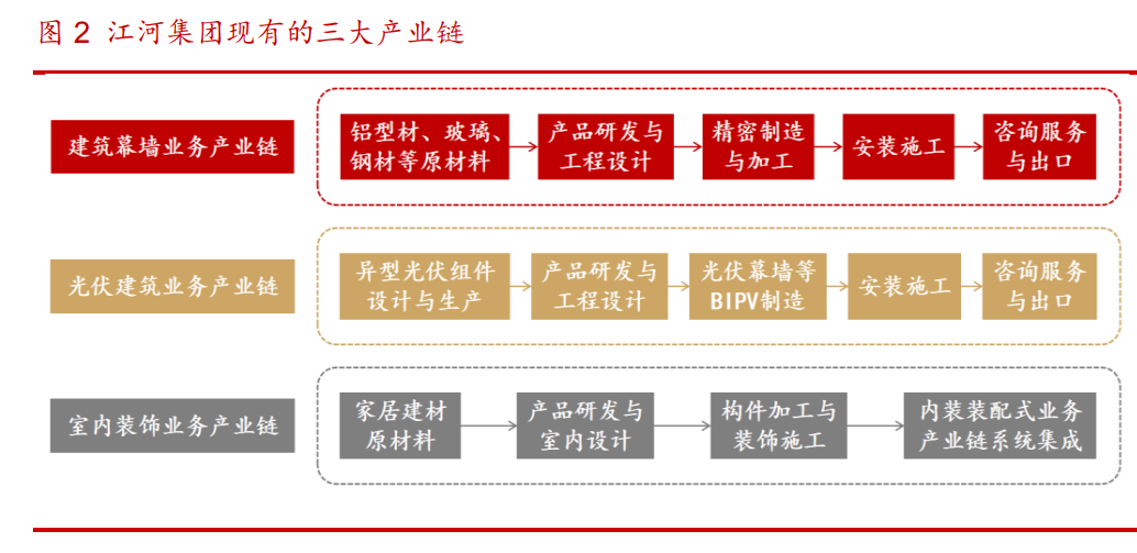 三大业务板块产业链齐全,异型光伏组件生产布局加速BIPV业务差异化发展,在建筑幕墙与光伏建筑领域,是集产品研发、工程设计、精密制造、安装施工、咨询服务、产品出口于一体的系统整体解决方案提供商。在装配式内装上采取“自主研发+产业链系统集成”的发展模式,全力推进内装装配式业务发展。