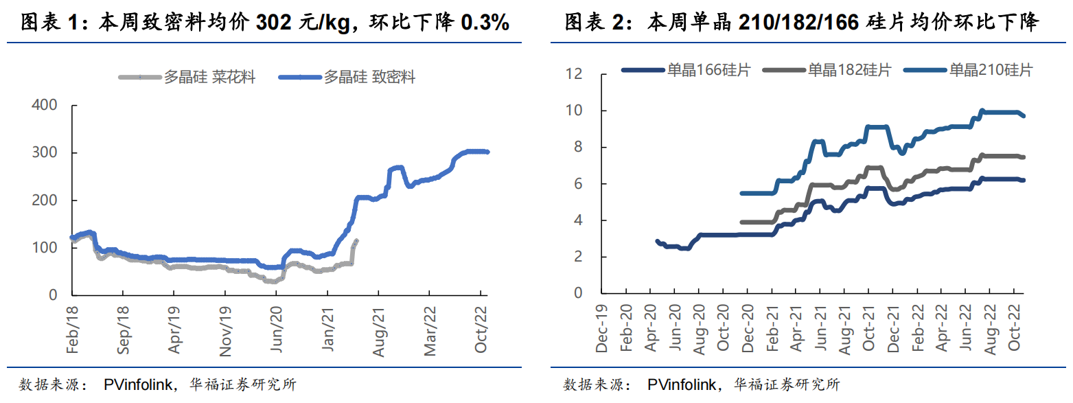 本周硅料成交均价由303元/kg下降至302元/kg,环比降幅0.3%。虽然降幅不大,但近两年来持续上涨居高不下的硅料价格首次出现了下探。机构认为硅料价格的松动是一种信号,对于光伏产业中下游利润传导具有积极的正向促进作用。