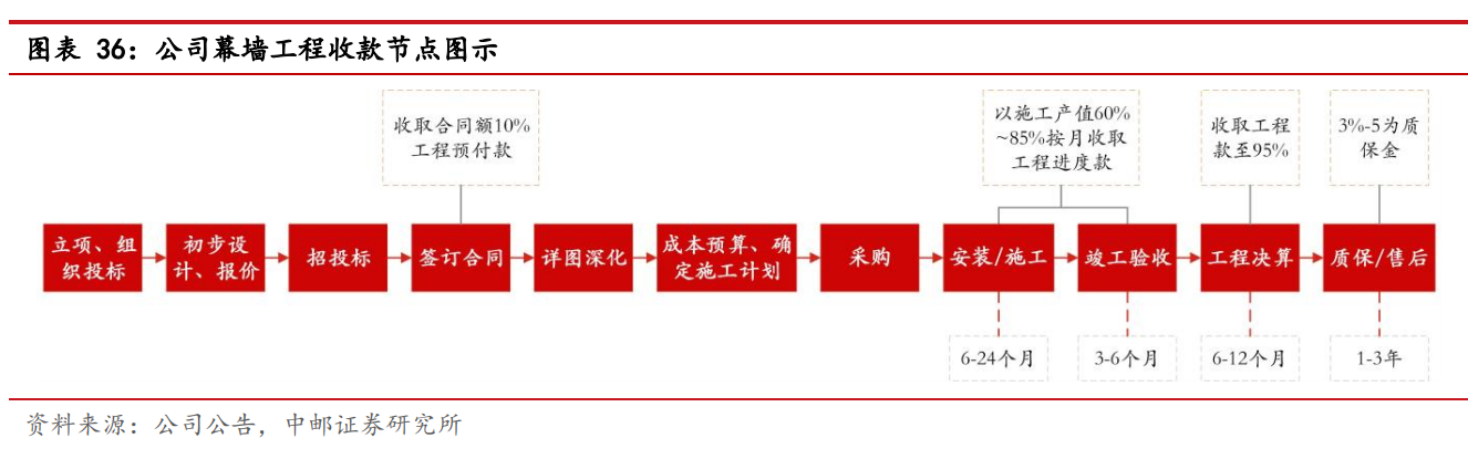 建筑装饰板块业务是公司的基石产业,以抓好利润和现金流两大指标为核心,中标的项目以现金流和利润为最重要的考核指标。公司中标的幕墙工程在签订合同时收取10%的预付款,项目建设过程中按施工产值的60%-85%按月收取工程进度款,幕墙工程项目完工即可收回约80%的合同额,经过3-6个月的竣工周期,要求收款至85%-97%,最后部分则为在2年内的质保期内收取。