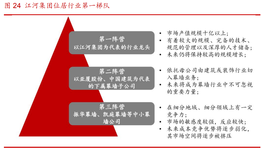 目前幕墙企业的发展开始逐渐出现分化,呈现出强者恒强的趋势,公司位列行业龙头梯队,行业强者恒强格局明朗。第一阵营企业以江河创建、远大中国等行业龙头为代表,年产值普遍在十亿元以上,具有完善的工程体系和人才体系;第二阵营以大型建筑企业的子公司为主,这类公司可以依托母公司的资源开展幕墙工程业务;第三阵营则以中小型幕墙企业为主,在局部地域或特定幕墙领域具有一定竞争力。