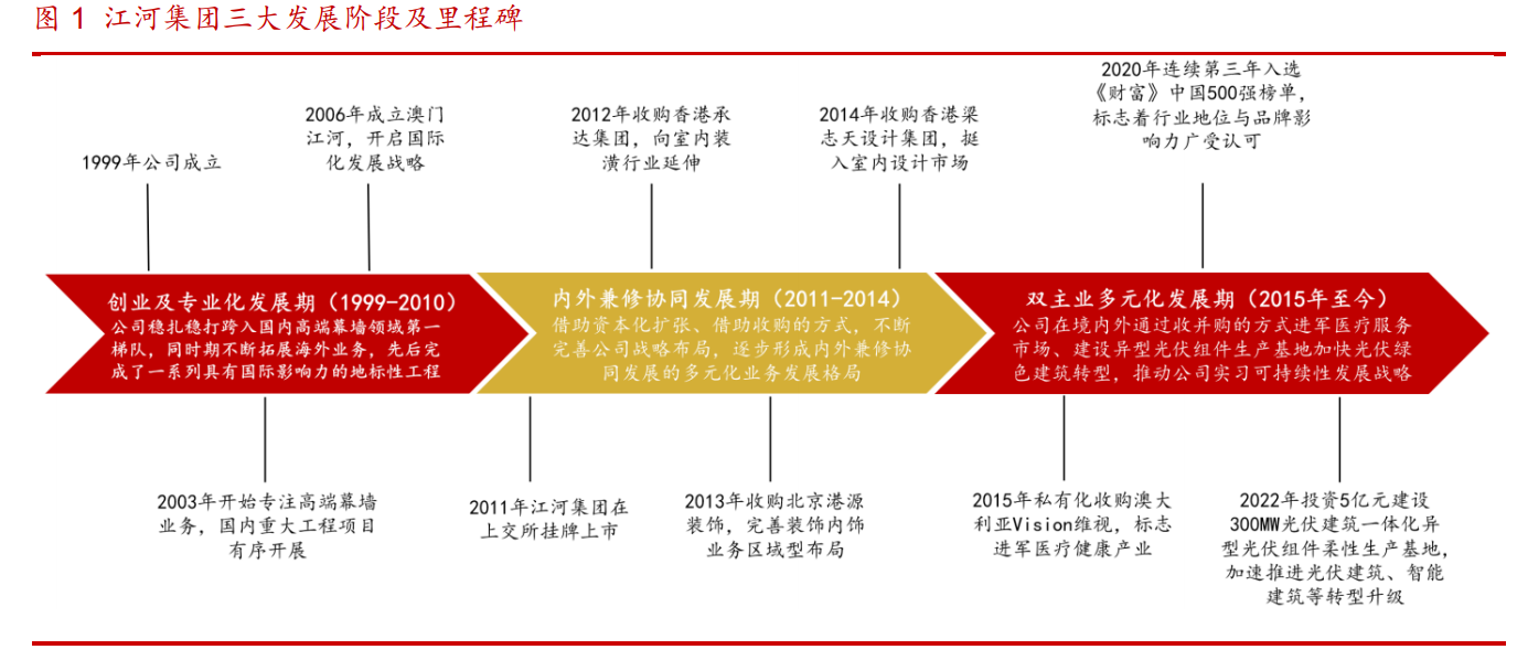 公司是国内幕墙龙头到双主业、多品牌、多元化的跨国企业集团,行业领导者地位得到确立。2015年进军医疗健康产业,以高品质眼科医疗服务为切入点,步入双主业、多元化发展阶段。2022年在分布式光伏快速推广的风口浪尖上,充分发挥幕墙作为BIPV的流量入口效应,全力推进光伏建筑业务的发展。