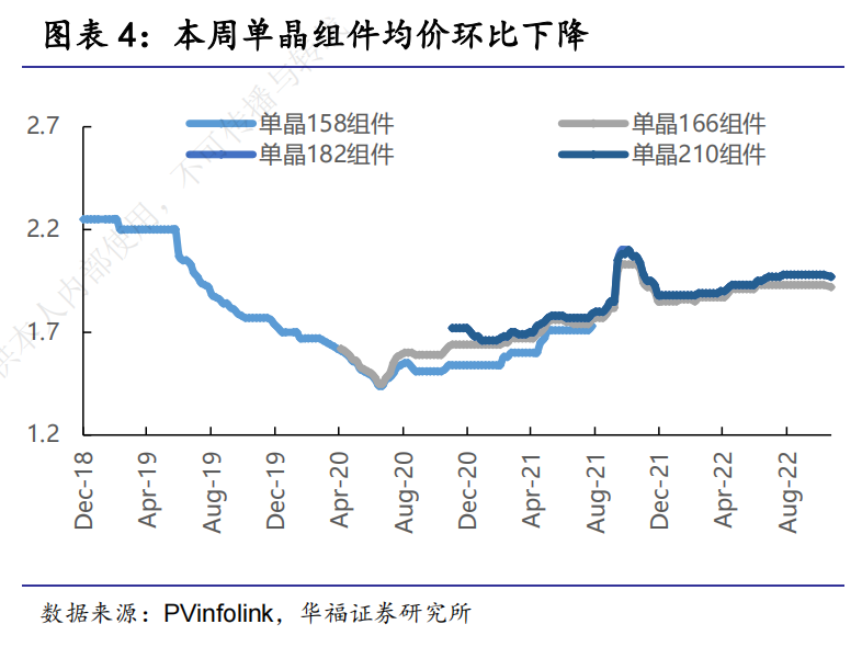 再者,随着上游价格拐点的逐渐清晰,近期组件价格也开始进入了下行通道。数据显示,本周部分一线组件企业价格并无法成功上浮报价、甚至部分价格下滑,均价区间略微走跌。