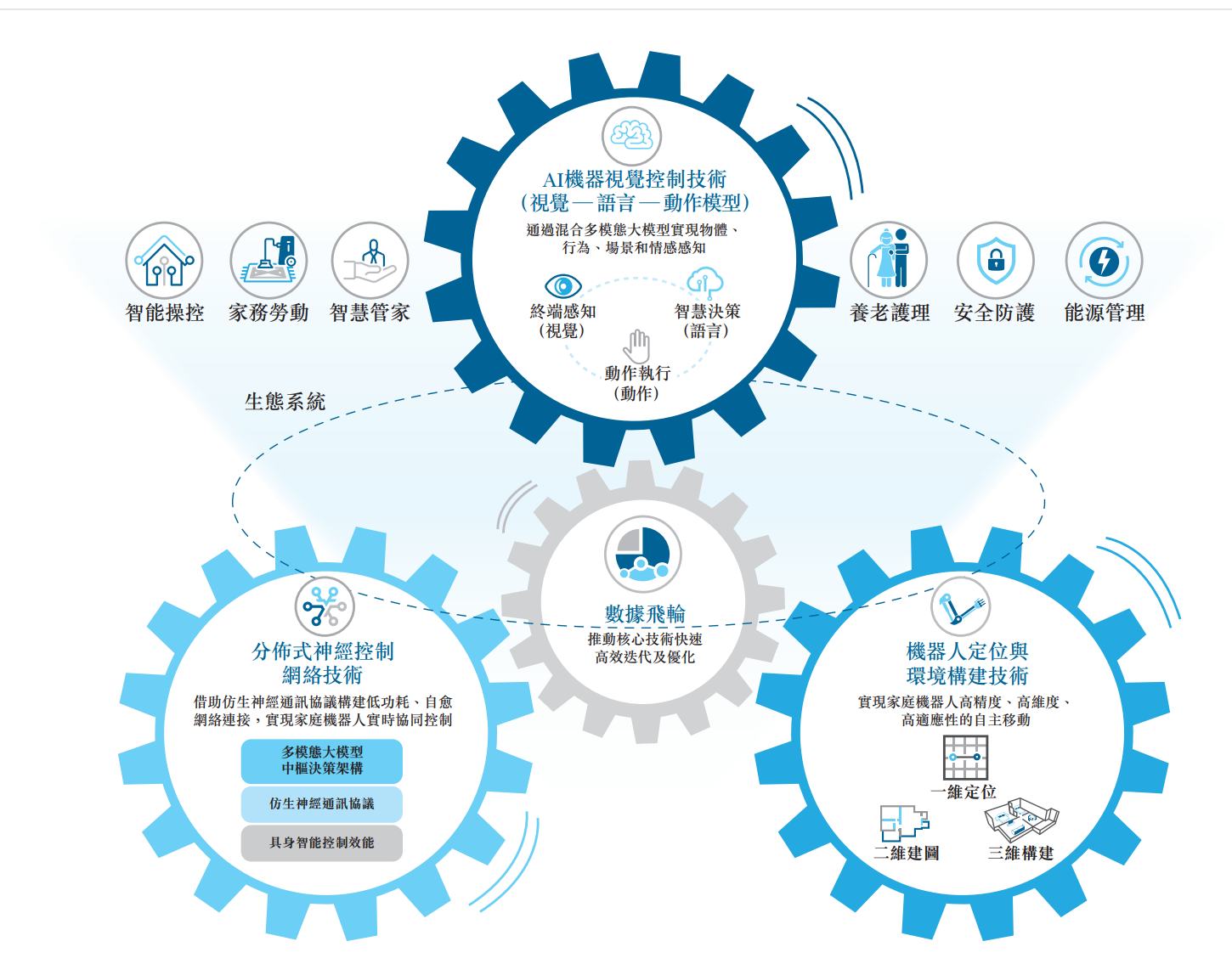 该公司自主研发三项核心AI具身机器人技术,即机器人定位与环境构建技术、AI机器视觉控制技术及分布式神经控制网络技术,三大技术应用于家庭生态系统产品矩阵,通过场景化及用户反馈的海量数据,推动核心技术快速高效迭代及优化,从而形成飞轮效应。而该等技术也成为了公司差异化于同行的强大竞争优势。数据飞轮通过强化技术进一步稳固产品力,进而稳固公司在全球AI具身家庭机器人系统行业的领导地位,及推动业绩增长。