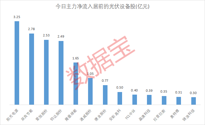从今日主力资金净流入额来看,阳光电源、双良节能、爱旭股份、钧达股份、隆基绿能、通威股份6股过1亿元,依次为3.25亿元、2.78亿元、2.53亿元、2.49亿元、1.65亿元、1.05亿元。
