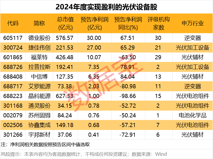 受产业主要制造环节阶段性供需失衡影响,2024年光伏板块个股业绩表现普遍不佳。截至目前,隆基绿能、通威股份、晶澳科技、爱旭股份、TCL中环等行业龙头均大幅预亏,仅10股实现盈利。德业股份、捷佳伟创和福莱特去年净利润规模在10亿元以上,其中德业股份和捷佳伟创均逆行业大势,净利润实现同比60%以上的高增长。