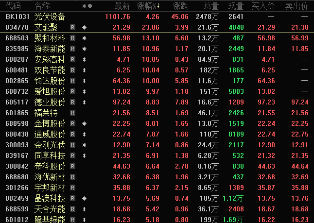 光伏设备板块大幅冲高,行业指数涨幅榜排名第一,成份股中,安彩高科、双良节能、钧达股份、爱旭股份等多股涨停;聚和材料大涨13.1%;德业股份、福莱特、金博股份、通威股份、金刚光伏等股跟涨,幅度均超过7%。