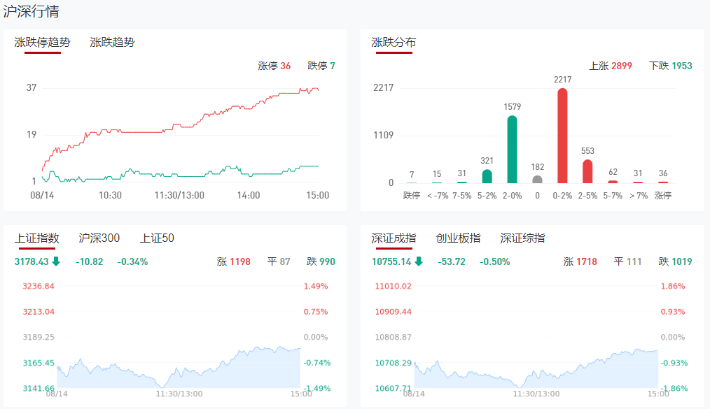 8月14日,大盘全天探底回升,三大指数仍收跌,沪指相对偏强。截至收盘,沪指跌0.34%,深成指跌0.5%,创业板指跌1.02%。总体上个股涨多跌少,两市超2800只个股上涨。沪深两市今日成交额7419亿,较上个交易日缩量216亿。