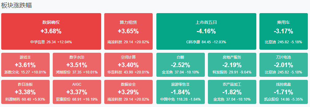 盘面上,AI概念股集体反弹,其中数据要素方向领涨,中原传媒、浙数文化、安妮股份等涨停;算力概念股震荡走强,鸿博股份涨停,首都在线、铜牛信息涨超10%;信创概念股尾盘拉升,南凌科技、英飞拓、竞业达涨停。SPD概念股继续活跃,开开实业、英特集团涨停。中字头个股午后走强,中远海科、中钢国际涨超5%。券商股冲高回落,首创证券一度涨停,红塔证券跌超5%。下跌方面,地产股全天低迷,天房发展、深振业A跌停。板块方面,数据确权、算力租赁、网络安全、信创等板块涨幅居前,汽车整车、房地产、CRO、银行等板块跌幅居前。