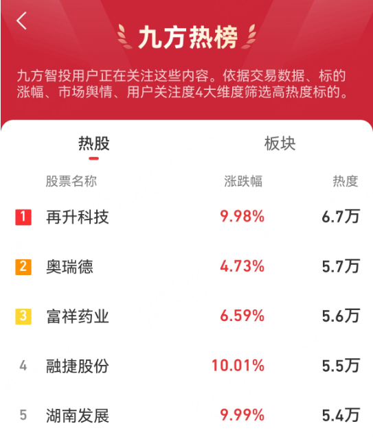 九方热榜:再升科技,奥瑞德,富祥药业,融捷股份,湖南发展