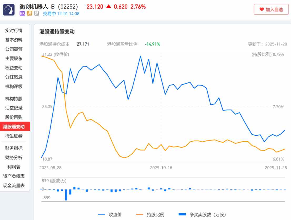 然而,在10月9日微创机器人开启下行行情后,港股通资金却未积极买入,整体持股比例一直维持在6-8%之间,以致持仓成本一直处于27港元以上的高位。截至11月末,港股通对微创机器人的持仓亏损达到14.91%。