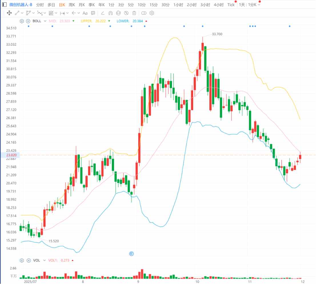 随着10月8日微创机器人股价再次站上BOLL线上轨并拉出一根长上影线,后续回调信号已然触发。10月9日,微创机器人股价收跌7.54%,开启了为期超过30个交易日的下行区间。