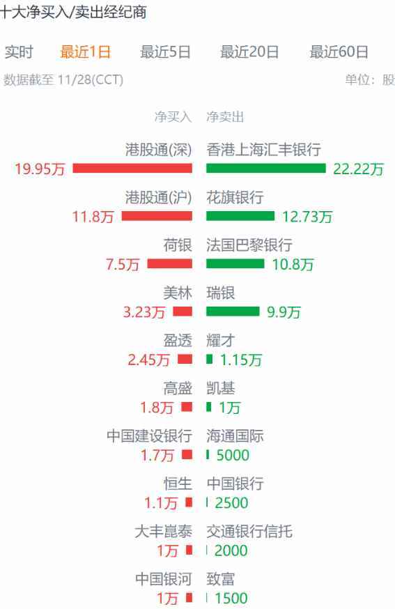 近5日,微创机器人的卖方席位前五位分别为花旗银行、港股通(沪)、香港上海汇丰银行、东吴和美林,分别卖出131.35万股、66.65万股、53.16万股、15.50万股及4.47万股。而买方来看,港股通(深)为最大买方,买入97.70万股。而在11月28日,港股通(深)和港股通(沪)便已是微创机器人的单日最大净买入方,分别买入19.95万股和11.80万股。