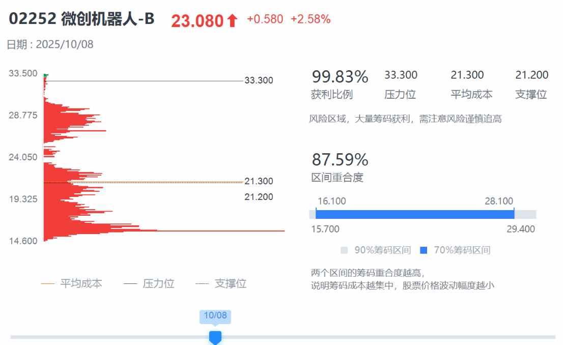 从这一阶段来看,微创机器人股价沿5日快速拉升,“六连阳”走势形成了一段陡峭的上升通道。只是近一个月的“股价过山车”并没有“喝退”场内的长投资金和埋伏的底部浮筹,从10月8日的筹码分布图来看,微创机器人筹码峰依旧聚集在15-16港元的绝对低位,远低于此时21.20港元的股价支撑位。