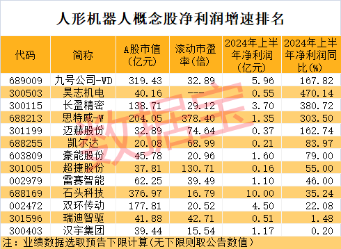 据证券时报·数据宝统计,根据目前披露的业绩数据,按照预告净利润下限计算(无下限则取公告数值),13只人形机器人概念股上半年净利润同比增长(含扭亏为盈)。九号公司-WD、昊志机电均已率先披露半年报,公司净利润均实现大幅增长。