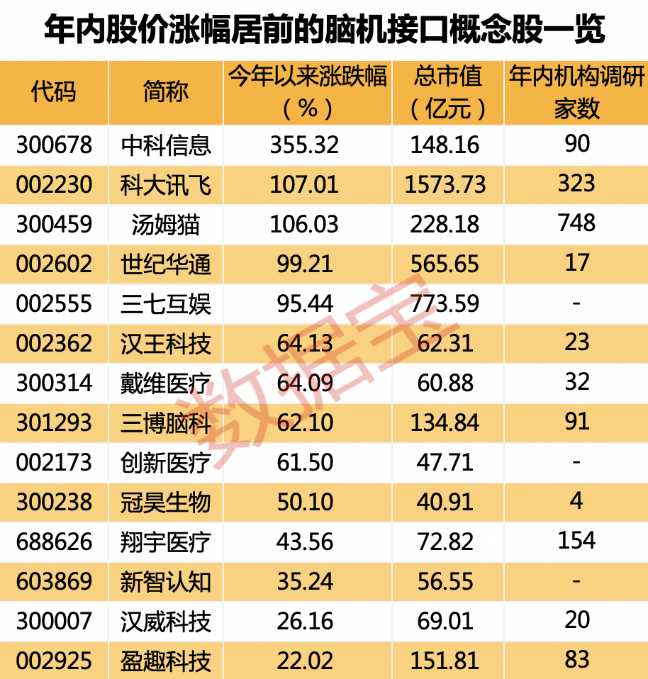 中科信息年内股价涨幅居首,累计上涨355.32%,公司引入的医疗脑机接口技术,主要用于智慧麻醉、智慧康复两大应用场景,智慧麻醉应用场景方面,正在开展麻醉深度监测脑机接口设备选型;智慧康复应用场景方面,引进的脑机接口设备已到位,目前正在与四川大学华西医院相关专家设计动物实验方案。