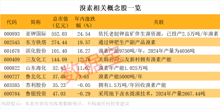 生产企业方面,证券时报·数据宝根据公开资料梳理,亚钾国际拥有溴素产能2.5万吨/年,山东海化拥有产能超1万吨/年,苏利股份拥有回收溴素1.5万吨/年的产能,鲁北化工拥有产能5000吨/年,滨化股份披露2024年溴素产量为4036吨,鲁银投资披露2024年度生产溴素2667.44吨。