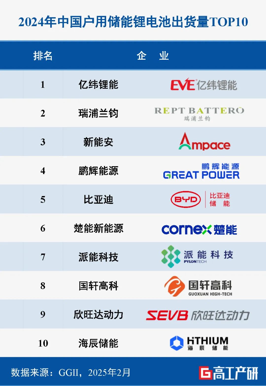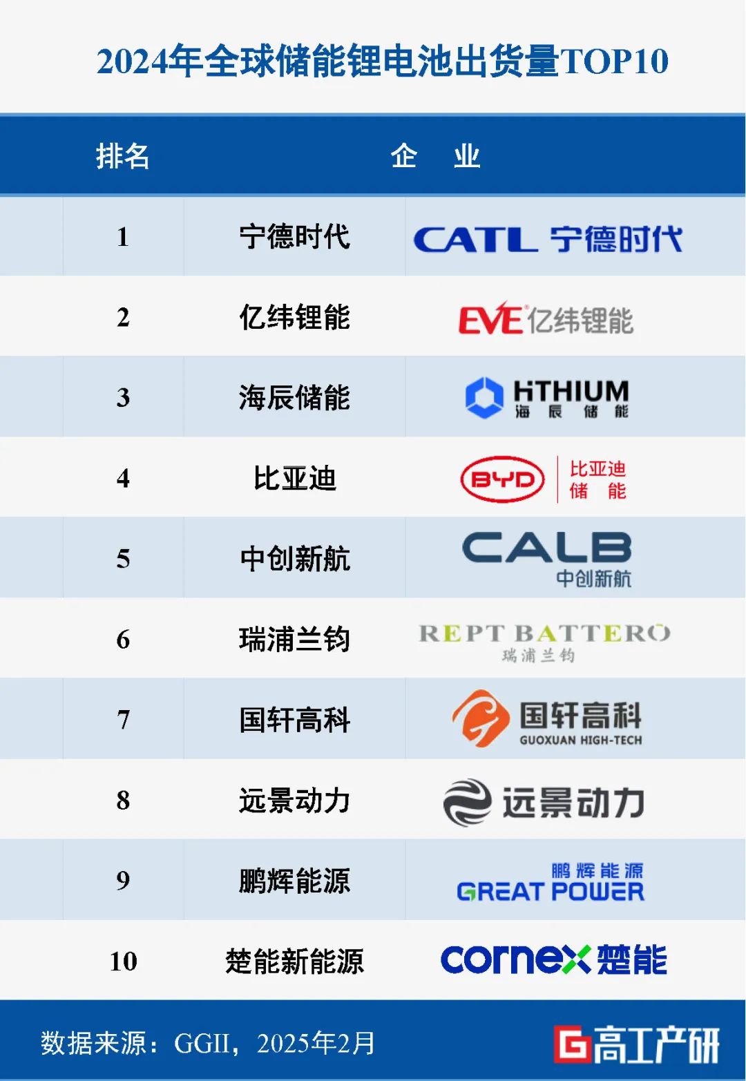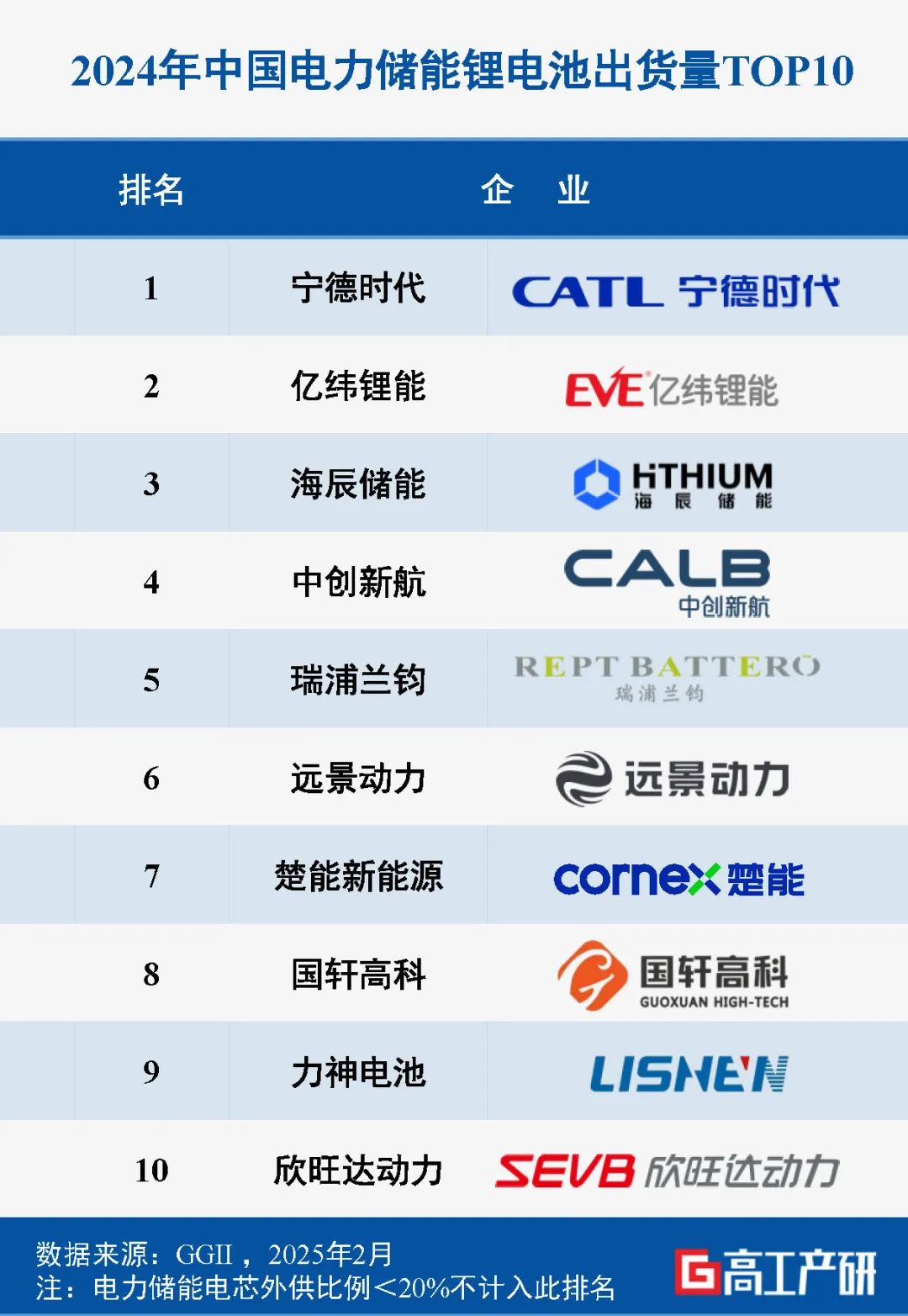 GGII正式发布2024年储能锂电池榜单,以下为出货量口径,均扣除代工量。