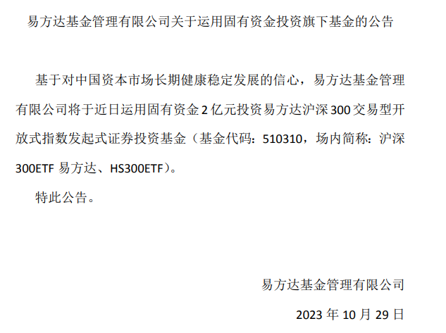 与此同时,公募基金行业规模最大的易方达基金也于10月29日发布自购公告,公司拟于近日运用固有资金2亿元投资旗下易方达沪深300ETF。