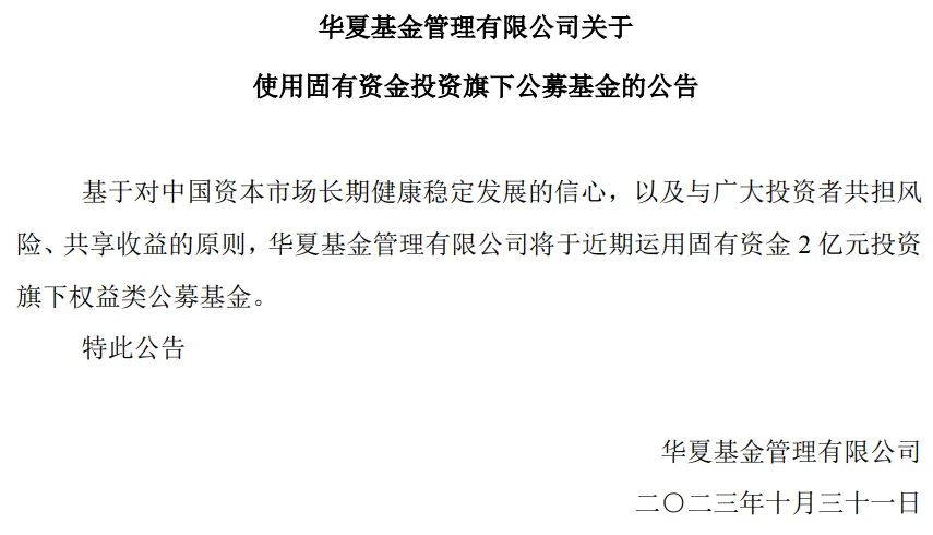 10月31日,华夏基金公告,基于对中国资本市场长期健康稳定发展的信心,以及与广大投资者共担风险、共享收益的原则,华夏基金将于近期运用固有资金2亿元投资旗下权益类公募基金。