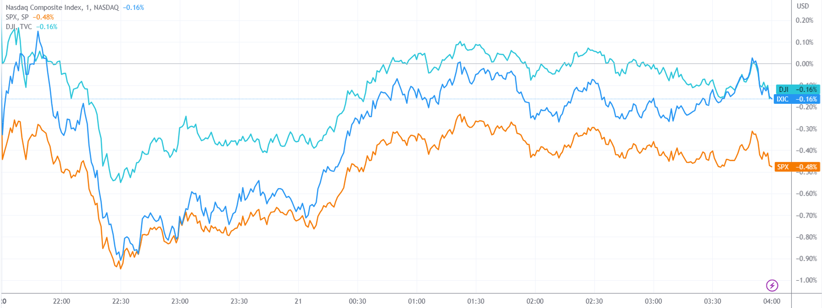 (三大指数分钟线图,来源:TradingView)
