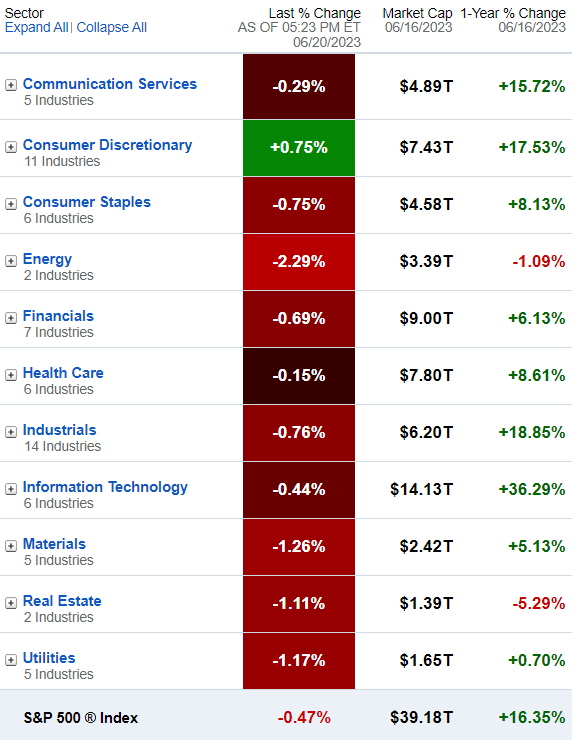 周二标普500指数11个板块只有可选消费1个收涨,背后的原因也是特斯拉一家大涨拉动;能源(-2.29%)、材料(-1.26%)板块领跌,反映出市场对经济前景迷茫的状态。