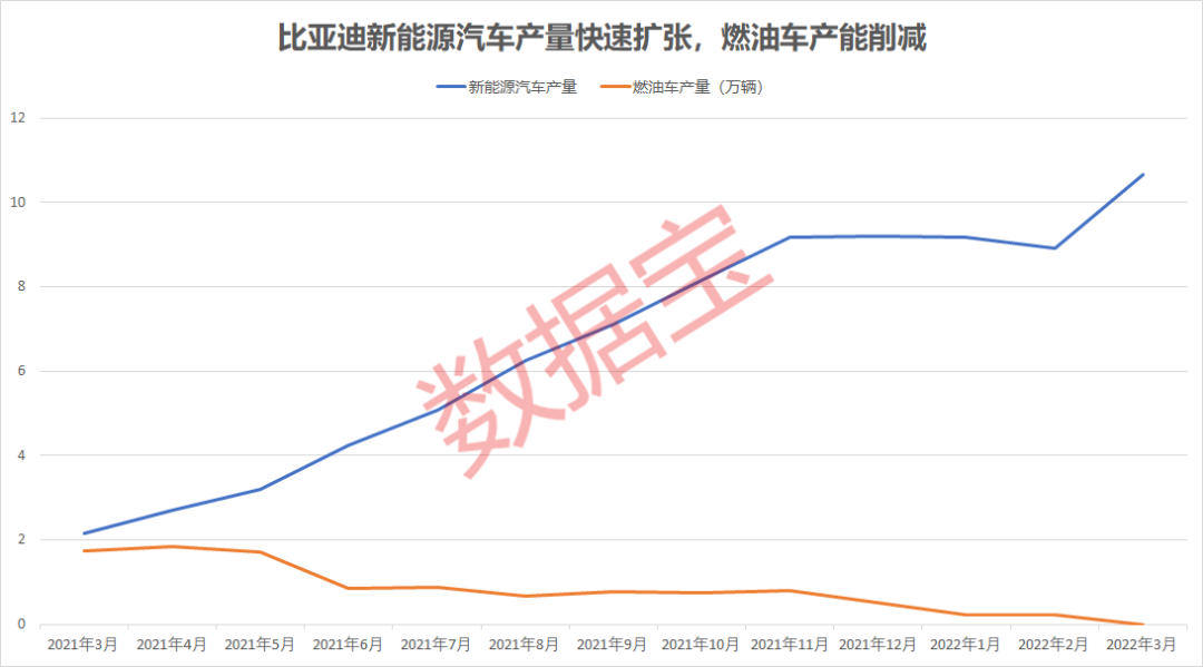 在过去的一年间,比亚迪在快速扩张新能源汽车产线的同时,也在逐步削减着燃油车的产能,自去年5月起燃油车的产量逐步下降。根据港股比亚迪股份披露的产销快报,公司今年3月燃油汽车产量、销量均为零,而在去年同期,公司新能源汽车与燃油车产销相差无几,燃油车产量1.7万辆,新能源汽车产量2.15万辆。
